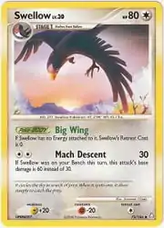 Swellow (Japanese: オオスバメ Ohsubame) is a Colorless-type Stage 1 Pokémon card. It is part of the Legends Awakened expansion.