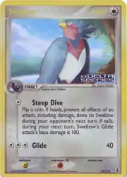 Swellow (Japanese: オオスバメ Ohsubame) is a Colorless-type Stage 1 Pokémon card. It is part of the EX Delta Species expansion.