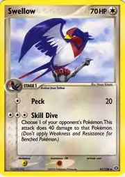 Swellow (Japanese: オオスバメ Ohsubame) is a Colorless-type Stage 1 Pokémon card. It is part of the EX Emerald expansion.