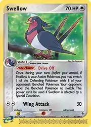 Swellow (Japanese: オオスバメ Ohsubame) is a Colorless-type Stage 1 Pokémon card. It is part of the EX Ruby & Sapphire expansion.