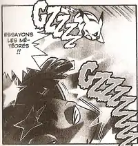 Luxio jumps into the air and its tail glows yellow. It then swings its tail, releasing multiple yellow stars with golden sparkles around them from its tail at the opponent. | ||