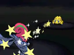 Luxray jumps into the air and its tail glows yellow. It then swings its tail, releasing multiple yellow stars with golden sparkles around them from its tail at the opponent. | ||
