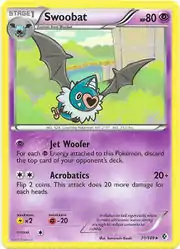 Swoobat (Japanese: ココロモリ Kokoromori) is a Psychic-type Stage 1 Pokémon card. It is part of the Boundaries Crossed expansion.