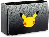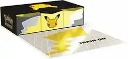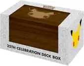 As part of the continued Pokémon 25th Anniversary celebrations, Ultra Pro released the Pokémon 25th Celebration Deck Box in late 2021. The box is made of a dark wood with a smooth finish and features a laser-etched 25th anniversary logo on the lid. The lid can swing open and is secured shut with magnets. The box also has a rollout side compartment that can be used to store smaller accessories. Each box can store at least 100 double-sleeved cards.