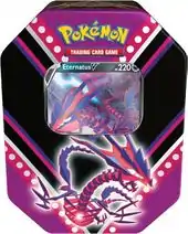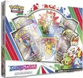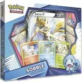The first products of the Sword & Shield TCG Series were a trio of Galar Collection boxes, released on November 15, 2019 in conjunction with the worldwide launch of the Pokémon Sword and Shield video games. The three collections featured the Galar region's starter Pokémon—Grookey, Scorbunny, and Sobble—and included Line Holofoil prints of all three. The focal Pokémon of each box was included as a SWSH Black Star Promotional card, while the other two starters were sourced from the then upcoming Sword & Shield expansion. Each collection also included an oversized card featuring either Zacian or Zamazenta as a teaser for the Pokémon V mechanic and their appearance as the game mascots for Pokémon Sword and Pokémon Shield, respectively. These cards lacked the Pokémon's type, Weakness, Resistance, Retreat Cost, Ability, Energy cost, and Evolution Stage. In addition to the showcased cards, each box contained four booster packs (typically two Cosmic Eclipse, one Unbroken Bonds, and one Evolutions), a code card for the Pokémon Trading Card Game Online, and a pin of the focal starter.