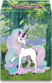 Enchanted Glade was the third entry in the Ultra Pro Gallery Series and saw release in early 2022. Items in this series feature a green watercolor-like background overlaid with trees in varying shades of green and purple. The trees are textured and layered in such a way they achieve a screen-printed look. Stock Ken Sugimori images of Galarian Rapidash, Jigglypuff, Clefairy, Swirlix, and Cutiefly dot the artwork.