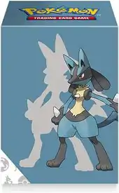Deck box: A Lucario Full View Deck Box can carry a fully-sleeved 60-card deck plus extras. Each one is packaged with a divider that can be inserted to organize cards.