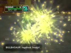 | The leaves on Turtwig's head glows white and its whole body glows yellow and sparkles, healing all of Turtwig's injuries. | |||