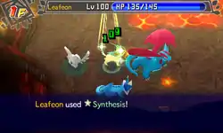 In Gates to Infinity, Synthesis restores 50% of max HP in clear weather, 75% in Sunny weather, and 25% in Rain, Hail, or Sandstorm. In Super Mystery Dungeon, it restores 40% in clear weather, 75% in Sunny weather, and 25% in Rain, Hail, or Sandstorm.