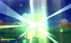 | Torterra's body becomes surrounded by white sparkles and its body glows white. The leaves on its back then glow brightly, healing its injuries. | |||