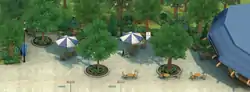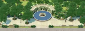 The park is divided into three areas: the fountain area in the center, the nature area to the west, and the café area to the east.