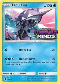 Tapu Fini (Japanese: カプ・レヒレ Kapu-Rehire) is a Water-type Basic Pokémon card. It was first released as part of the Unified Minds expansion.