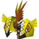 The mask itself is mostly yellow with black, orange, and white markings. There are three white triangular markings with black edges on the top of each half of the mask, which create diamond-shapes when the mask is closed. The 'eyes' consist of a white diamond connected to a slightly larger orange diamond, which is inside a larger yellow diamond. Each of these shapes is edged in black. On each half of its beak is an orange triangle with a white rim. There are wing-shaped structures on each side, toward the back. Tapu Koko is able to pull the mask together and hide its upper body inside, creating the impression of a stylized rooster.