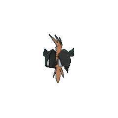 Tapu Koko is a vaguely rooster-like Legendary Pokémon. Tapu Koko's head and torso are black with white markings on its chest, just above its eyes, and on top of its head. Extending from the top of its head is a large, orange plume with bristles along the back. There is a yellow marking covering the top bristle and half of the bristle below it. The bottom of this crest goes all the way to its neck, where it divides its face in half and creates a beak-like nose. It has small, blue eyes with yellow markings behind them. The lower half of its body is orange with four pointed projections: one short spine on the front and two short spines in the back, with one longer spine between them. These spines resemble a bird's tail feathers. Its thin arms have round, yellow structures encircling its shoulders. On each arm is a shell that appears to be half of a bird mask, and its hands end in two large claws to create a beak for the mask.