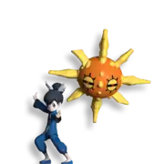 Tate's design is based on his appearance in Pokémon Omega Ruby and Alpha Sapphire. Solrock is Tate's signature Pokémon in the core series games. Solrock's Dex entry comes from Pokémon Ruby and Omega Ruby.