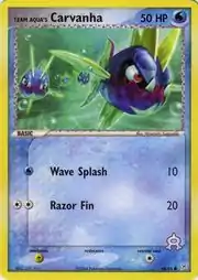 Team Aqua's Carvanha (Japanese: アクア団のキバニア Aqua Gang's Kibanha) is a Water-type Basic Pokémon card. It is part of the EX Team Magma vs Team Aqua expansion.