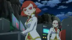 A pair of Team Flare Admins, one male and one female, debuted in A Meeting of Two Journeys!. They were seen on an island with Xerosic and some Team Flare Grunts, conducting an experiment with a prototype weapon utilizing some Zygarde Cells and the Mega Evolution energy previously collected by Team Flare.
