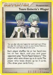 Team Galactic's Wager (Japanese: ギンガ団の賭け Galaxy Gang's Gamble) is a Supporter card. It is part of the Mysterious Treasures expansion.