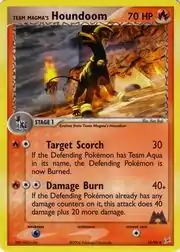 Team Magma's Houndoom (Japanese: マグマ団のヘルガー Magma Gang's Hellgar) is a Fire-type Stage 1 Pokémon card. It is part of the EX Team Magma vs Team Aqua expansion.