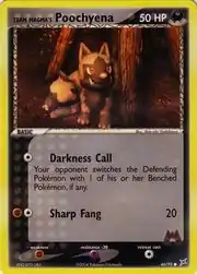 Team Magma's Poochyena (Japanese: マグマ団のポチエナ Magma Gang's Pochiena) is a Darkness-type Basic Pokémon card. It is part of the EX Team Magma vs Team Aqua expansion.