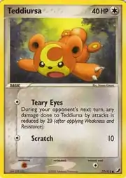 Teddiursa (Japanese: ヒメグマ Himeguma) is a Colorless-type Basic Pokémon card. It is part of the EX Unseen Forces expansion.
