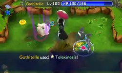 Gothitelle's eyes glow light green and it raises its arms and points its palms at the opponent. The opponent then becomes outlined in light green and Gothitelle can make the opponent float by moving its arms where it wants it to go. When Gothitelle puts its arms down, the light green glow fades away. | ||
