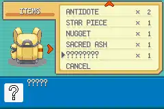 ?????????? may hold an item. The item will be called ???????? (eight marks). The item can only make a Pokémon that is holding it become glitched if migrated to Pokémon Diamond or Pearl. If the player tries to use it, Professor Oak will say that "the time isn't right" to use it. It can be bought using the Gameshark at a Poké Mart for ![]()
