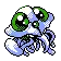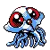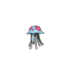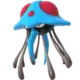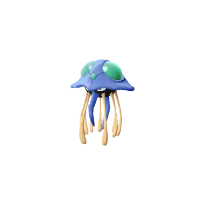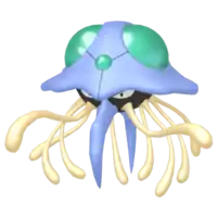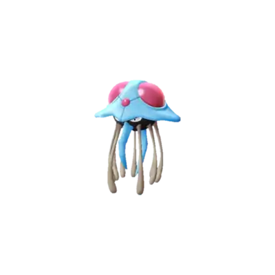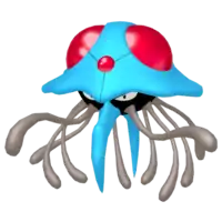 Tentacruel is a large, jellyfish-like Pokémon. It has a clear, light blue body that has two large, red orbs on either side and smaller orb in the center. Its eyes are visible in its round lower body, which is black. Extending from its lower body are two blue, beak-like appendages and numerous grayish tentacles. Its red orbs glow whenever it is excited or agitated, communicating with its own kind, and it may alert others to danger by stridently flashing them. They are also capable of refracting sunlight, storing energy, and firing ultrasonic waves.