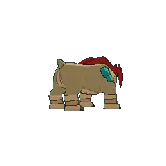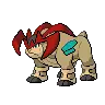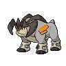 Terrakion is a bovine, quadrupedal Pokémon. It has a black, rounded forehead adorned with two sharp brown horns that curve forward. Its face is beige with orange eyes and a short snout. On top of its head are several short spikes. Down its back are two brown ridges that join just past its shoulders. There are two orange protrusions on its shoulders. The bands around its legs are the same color as its face, and it has black hooves underneath these bands. Its striped underside is also beige. It has a short, stubby tail.