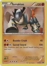 Terrakion (Japanese: テラキオン Terrakion) is a Fighting-type Basic Pokémon card. It was first released as part of the Emerging Powers expansion.
