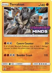 Terrakion (Japanese: テラキオン Terrakion) is a Fighting-type Basic Pokémon card. It was first released as part of the Unified Minds expansion.