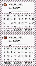 Compared to Generation I, gender symbols were removed from the Western versions, while the space and semicolon were also removed from the German version. The kana を / ヲ wo, small vowel katakana, question mark, and exclamation mark were added to the Japanese version.