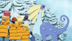 Later, Team Rocket broke into the freezer room and managed to steal Amaura with a truck. The group and Thaddeus soon discovered this, and Thaddeus feared Amaura would be in mortal danger because it was weak to heat. In the truck, Amaura managed to create an aurora in the sky, which was noticed by its parent Aurorus. With this, Aurorus and the group could track down where Amaura was taken. Amaura quickly collapsed because of its weakness to heat, however, and the aurora disappeared. Aurorus then let out a big roar; Amaura managed to hear this and gain more energy to create another aurora. When Team Rocket's truck got a flat tire, the group managed to track them down easily and defeated them, freeing Amaura. Amaura had become very weak by this point, however. Aurorus managed to bring its child's body warmth back to a very cold temperature, and so it got back up. Thaddeus arrived with a truck to take them back to the lab, and back in the freezer room, it played some more with Ash and his friends. None of Amaura's moves are known. | ||