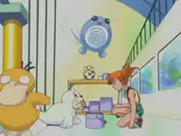 Misty stopped by the Cerulean Gym to drop off her Starmie and Horsea to play there in The Misty Mermaid. Upon arriving, she realized that her sisters continued to pursue their performing ambitions and neglected the Gym, and was also enlisted in their latest play, the Underwater Ballet. Team Rocket gate-crashed the performance, and tied Lily and Violet up. While Daisy freed the pair, the sisters watched Ash and his friends battle Team Rocket underwater. Violet sent out Misty's Psyduck in a bid to defeat Team Rocket, though its fear of water made it useless and embarrassing. The show proved to be a massive hit with the crowd, who were unaware that Team Rocket's appearance was not part of the show, and the sisters' show was booked for the next six months.