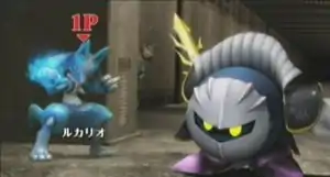 He later uses his aura to detect Snake hiding in a box and an approaching enemy threat. The team of Lucario, Meta Knight, and Snake then fight off clones of Princess Peach and Princess Zelda after finding them locked away in a trophy room. Once the clones are taken care of, they discover that the Halberd bridge is being piloted by a group of Mr. Game & Watches. The three of them knock all of the Mr. Game & Watches out of the window, where they land near Peach, Zelda (disguised as Sheik), and Fox who have gathered on the deck of the ship. The Mr. Game & Watches then revert into Shadow Bugs, which fuse into Duon. Lucario and Snake leap from the bridge to the aid of the trio already there, and they are joined by Falco, who skydives from his Arwing. They battle and defeat the monster, who collapses into wrecked metal, Shadow Bugs, and Mr. Game & Watch's trophy. Peach revives him, and he subsequently joins the player's party. Meta Knight, with the Halberd once again in his control, steers his vessel into brighter skies.