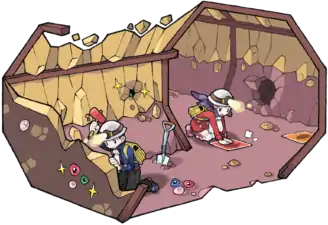 The game itself is similar to Battleship or Minesweeper. At the start, the cave wall is shown, represented by a grid full of squares. There are three depths of wall: the tan soil, which can be broken through in one hit, the darker soil, which needs two hits to be broken through, and the large rocks, which each need three hits to be broken through. The player digs into the wall with a pick, which chips away small areas of rock, and a hammer, which breaks a larger area of the rock. Each spot will hide one to four items, including spheres, Fossils, Revives, Heart Scales, shards, pre-Generation IV Evolution stones, Plates, and a few held items. Iron pieces are also in the wall, which cannot be dug out and prevent further mining upon discovery (that is, when they are uncovered on a direct hit, no other spaces are revealed until the next hit). Upon hitting a piece of iron a small 'ping' will be heard. Each hit will bring the wall closer to collapsing; if the wall collapses before everything is dug up, the game ends and the player is rewarded with what they dug up before the wall collapsed. Spheres the player has mined are stored separately from other items (called treasures in game); up to 40 sets of spheres and up to 40 treasures can be carried by the player, in order to acquire more, the player must make room in the Underground's Bag, for example, by burying the spheres or by sending the treasures to the Bag in the overworld.