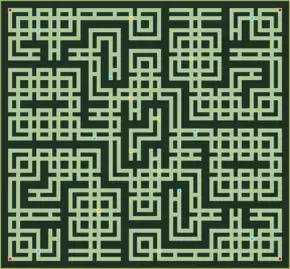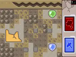 The vast majority of the tunnels are 5 squares wide, with some single-square-width passageways between parallel tunnels. The player can see roughly 12x15 squares on the screen at any given time (not accounting for side effects of the top-down perspective). By touching any area of the lower touch screen, a radar pulse indicates interactive objects within a 4-5 square radius, indicated by yellow sparkles. There appears to be a maximum of 8-10 sparkles that will display if a particular ping returns too many objects.