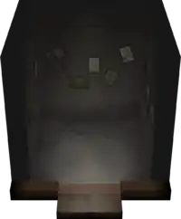 The insides of the ruined shop are filled with cardboard boxes and shopping carts. Some of these boxes are blocking one of the doors, leaving the right door the only way into the supermarket. A Poké Finder spot is located near the checkouts.