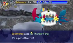 In Explorers of Time, Darkness and Sky, Thunder Fang is a move with 12 base power, 88% accuracy, and 15 PP. The user attacks enemy in the front, possibly inflicting paralysis and/or cringing on the target. This move is affected by Muzzled status condition.