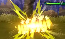 Luxray's fangs glow yellow and sparks of yellow electricity surround them. It then bites down on the opponent, and they become surrounded in yellow sparks; or, sparks of yellow electricity form inside Luxray's mouth. The sparks grow, forming into four fang-shaped, electric masses, and they stretch to the outside of its mouth. Luxray then bites down onto its opponent with the four electrical fangs. | ||
