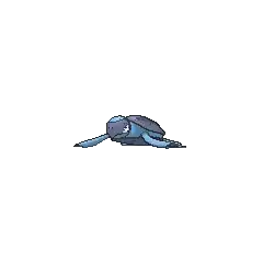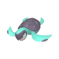 Tirtouga is a reptilian Pokémon resembling a baby leatherback sea turtle. Its body is blue with black spots on the edges of its flippers. Its black shell has six circular indentations in it. It has a black upper beak and a mask that covers most of its head. It has a light blue patch underneath its eyes.