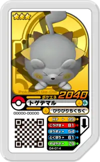 Togedemaru (Japanese: トゲデマル Togedemaru) is a Grade 3 Pokémon Ga-Olé disk. It is part of the fourth set.