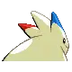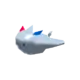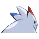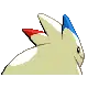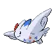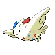 Togekiss is a white, avian Pokémon with an ovoid body. While its feet are small and situated closely together, its wings are broad and triangular. Red and blue triangular markings over its underside, and it has a short tail consisting of three feathers. On the back of its head are three spikes: a red-tipped one on the right, a blue-tipped one on the left, and a pure white one in the middle. Togekiss has a relatively flat face and small, black eyes.