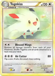 Air Cutter is a move in the Pokémon games that Togekiss can learn via Move Tutor in Pokémon Platinum, HeartGold, and SoulSilver. This card's Pokédex entry comes from Pokémon HeartGold and SoulSilver.