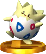 Togepi once again appears as a Poké Ball summon. After being released, it will use Metronome to trigger either Night Shade (causes stage darkness), Leech Seed (plants flower for gradual damage), Hypnosis (puts to sleep), Icy Wind (freezes) or Earthquake (traps in the ground).