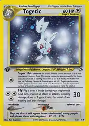 Togetic (Japanese: トゲチック Togechick) is a Colorless-type Stage 1 Pokémon card. It is part of the Neo Genesis expansion.