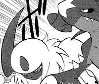 Kamaru was sent out to stall a rampaging Steelix while Katsuya tried rescuing a guy on there. Kamaru then appeared in Meragura Volcano along with Toki. Later, when Katsuya was caught by a Pokémon poacher, Kamaru and Absō freed him from the net. It was sent out in order to rescue a little girl's Eevee. When Toki was searching for buried treasure, Kamaru served as a mode of swimming transportation. Kamaru's only known move is Dragon Pulse. | ||