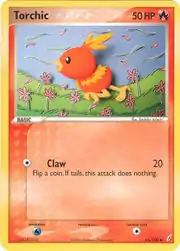 Torchic (Japanese: アチャモ Achamo) is a Fire-type Basic Pokémon card. It is part of the EX Crystal Guardians expansion.