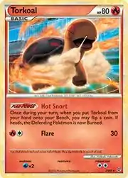Torkoal (Japanese: コータス Cotoise) is a Fire-type Basic Pokémon card. It is part of the Unleashed expansion.