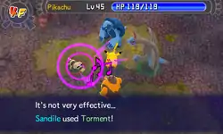 In Red Rescue Team and Blue Rescue Team, and Explorers of Time, Darkness and Sky, Torment is a move with 16PP and 100% accuracy. Instead of prohibiting a move from being used twice in a row, Torment seals the last move the target used. A sealed move will remain unusable until the user moves to the next floor; this is not considered to be a status condition. This move is affected by Taunt and the Muzzled status condition.